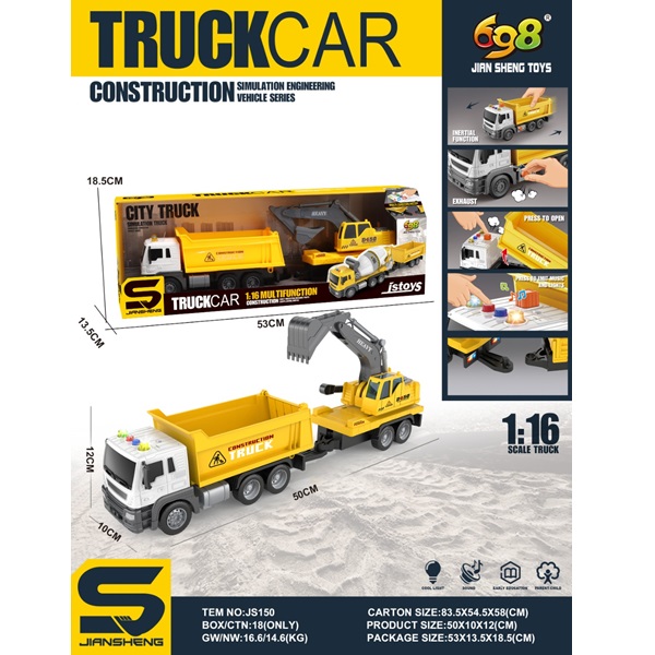 Самосвал с инерцией, прицеп экскаватор, звуки и огни, 1:16 69684