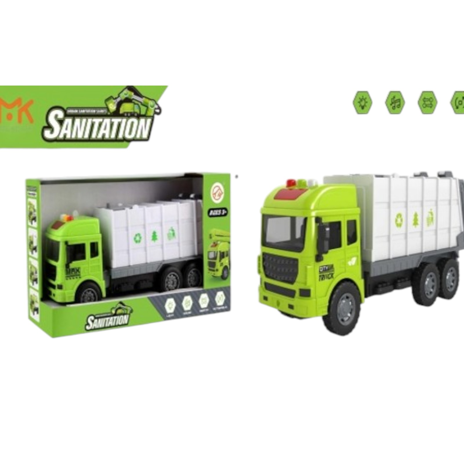 Зеленый самосвал с прицепом и контейнерами, с трением, кнопка давления, звуки и огни, 1:14 69678